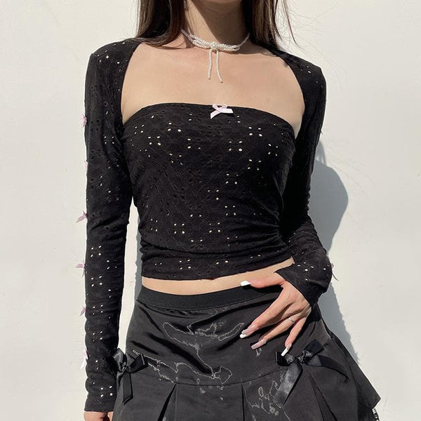 Hollow out bowknot contrast long sleeve shrug 2 piece tube cut out top