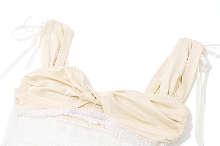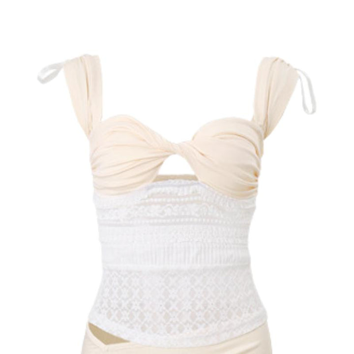Cap sleeve ruched lace ribbon backless top