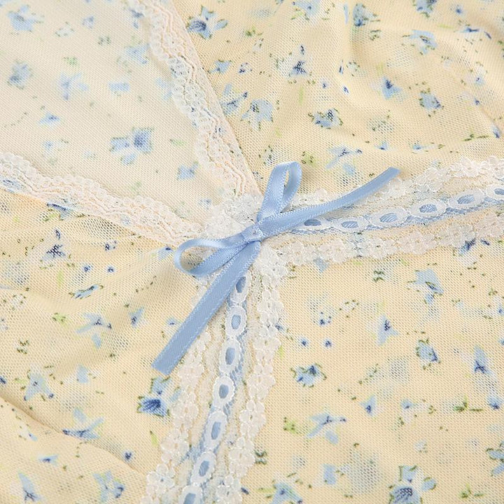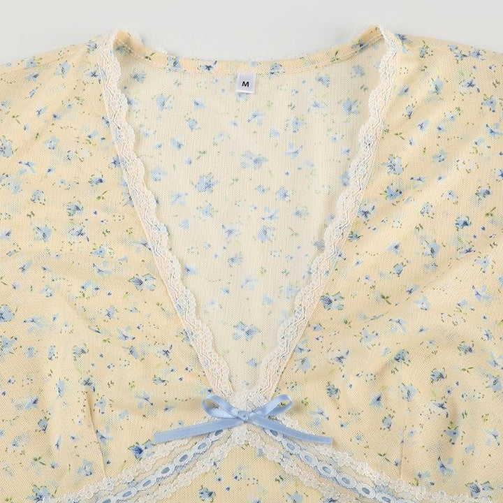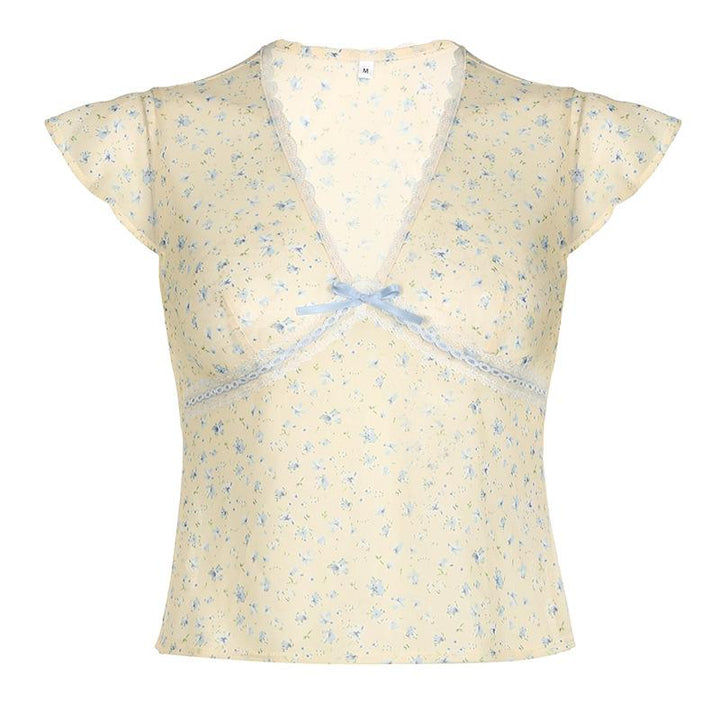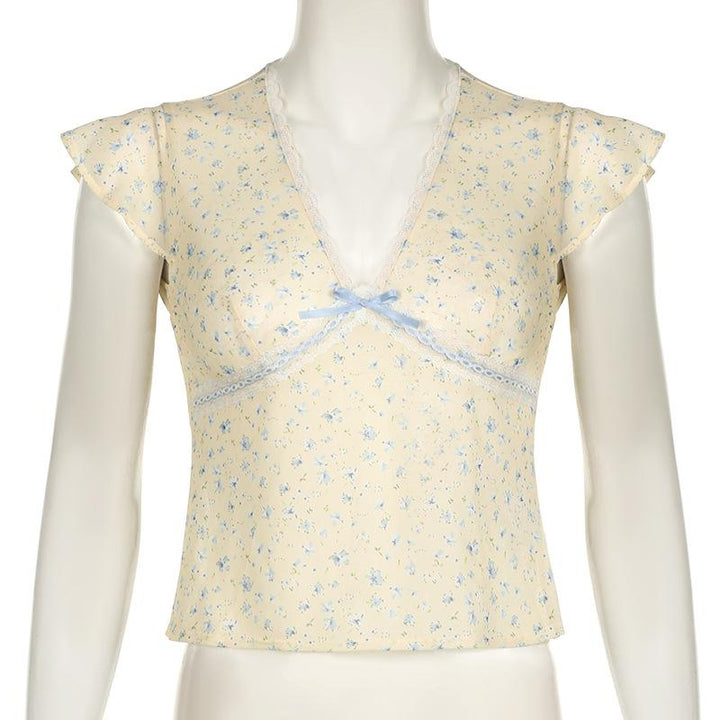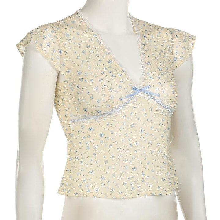Cap sleeve v neck print bowknot lace hem top