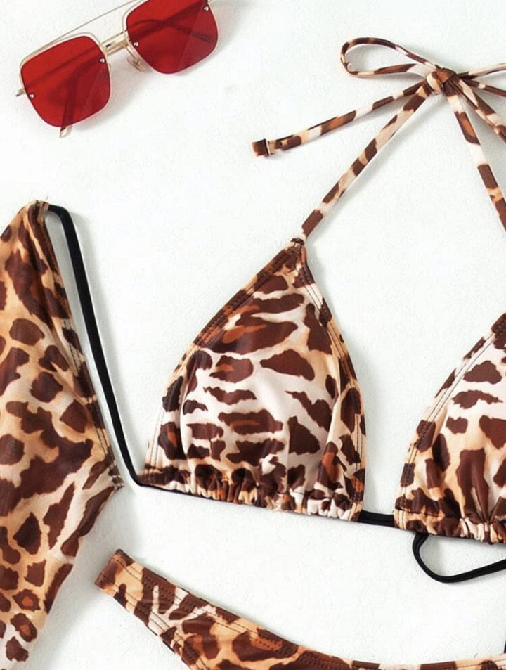 Contrast long sleeve halter self tie mini skirt 4 piece swimwear