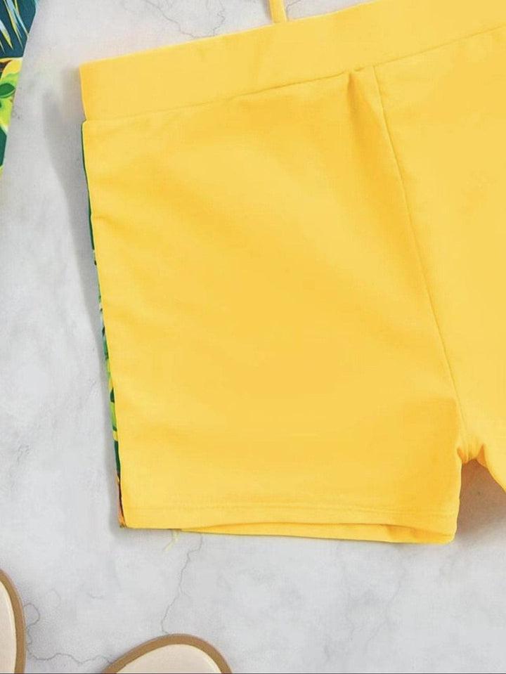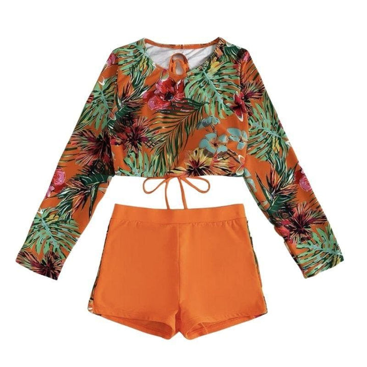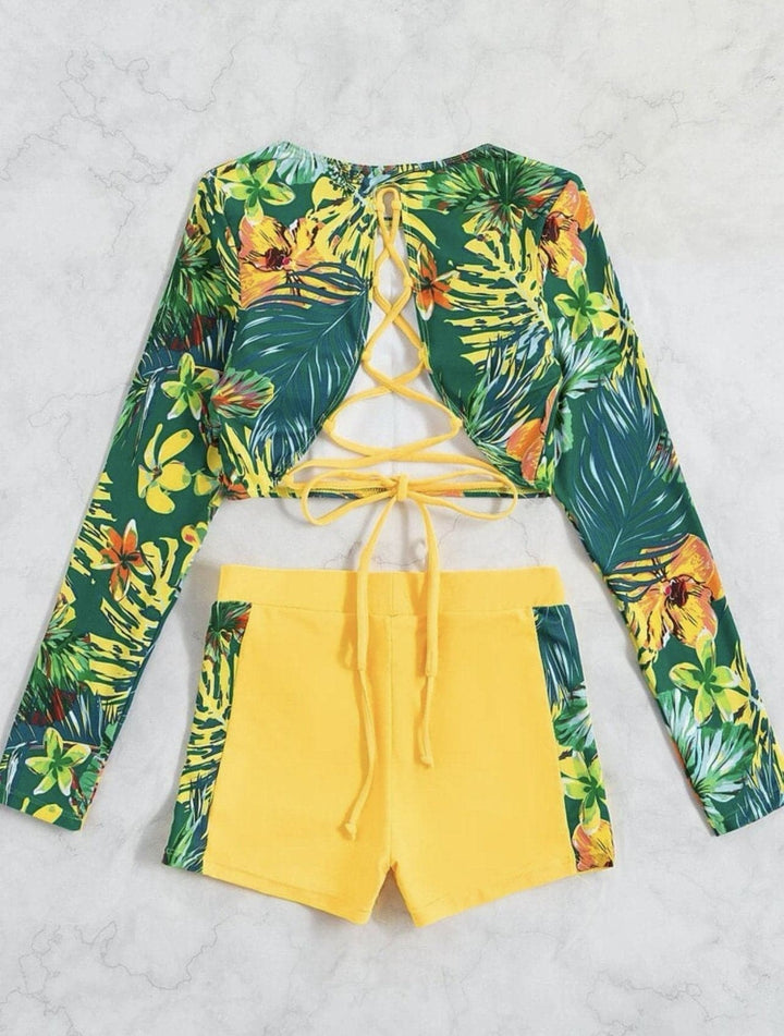 Cross back long sleeve hollow out contrast self tie pant bikini swimwear