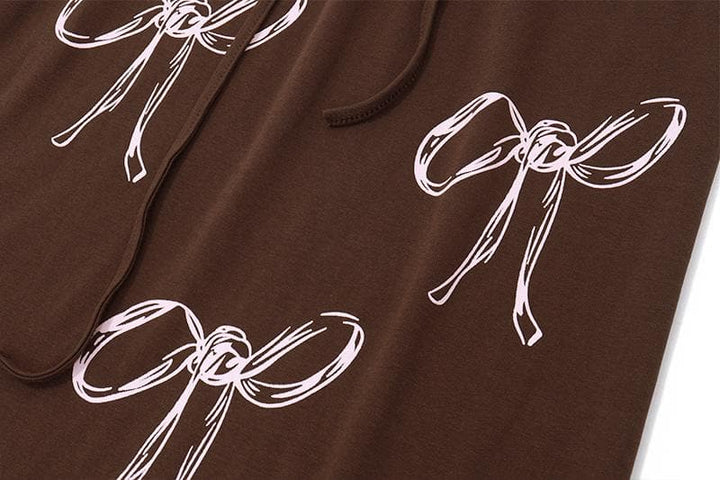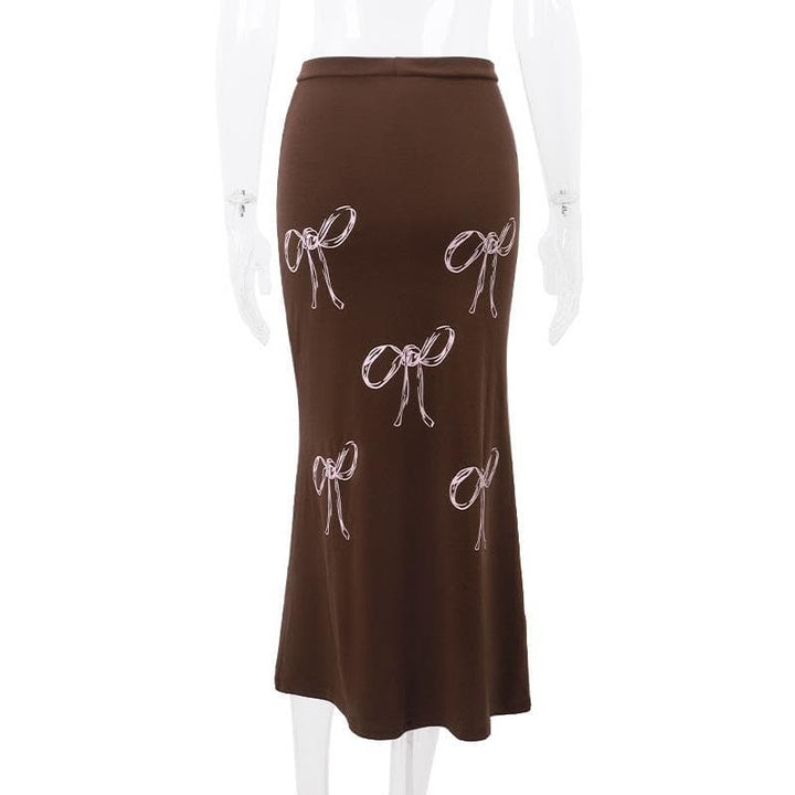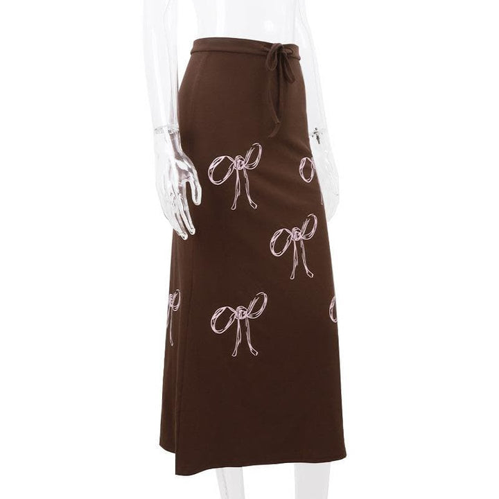 Drawstring ruched bowknot print contrast self tie midi skirt