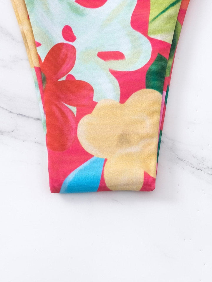 Flower print drawstring self tie halter backless mesh 3 piece swimwear