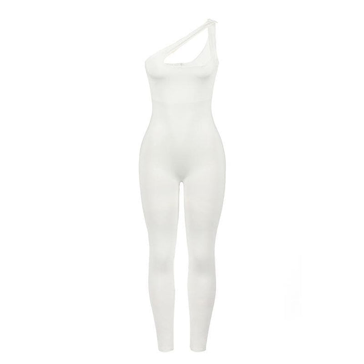 Irregular one shoulder zip-up solid hollow out jumpsuit