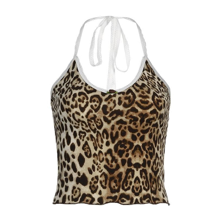 Leopard print halter v neck flower applique cami top