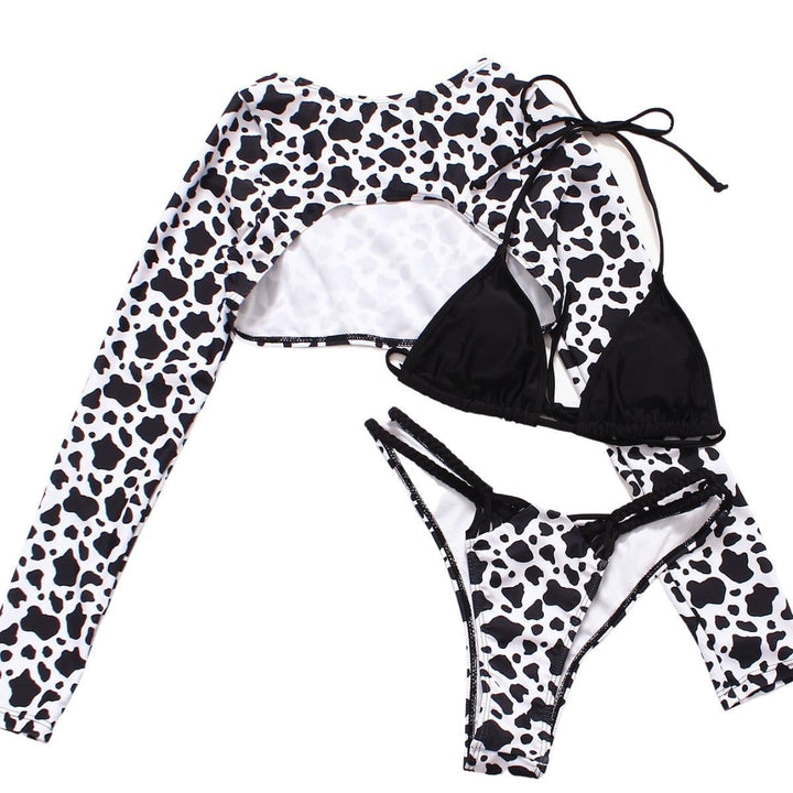 Leopard print long sleeve contrast halter 3 piece swimwear