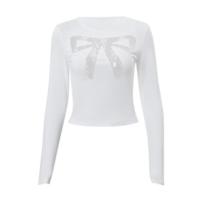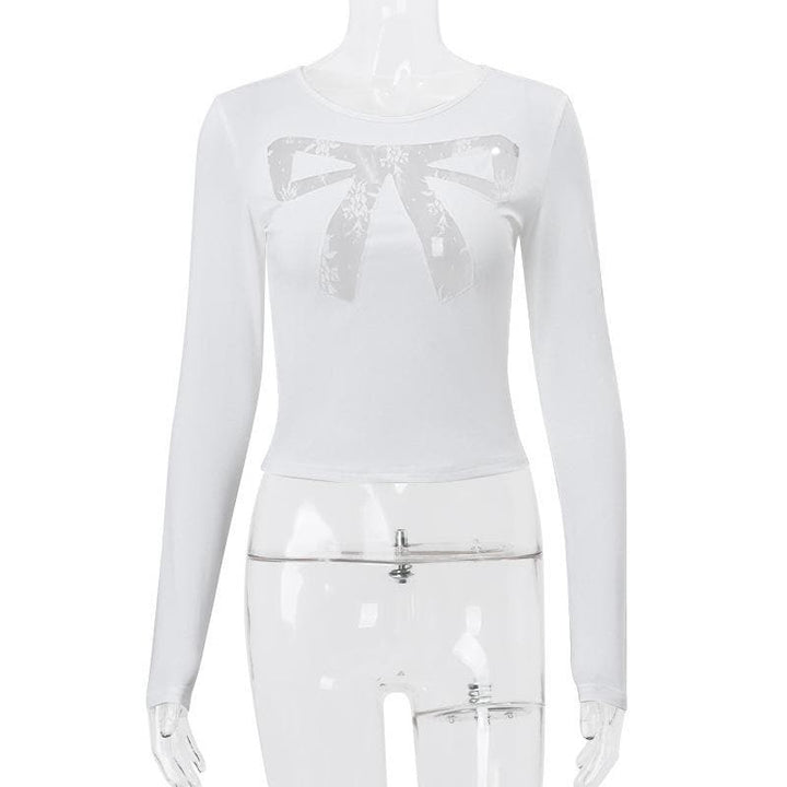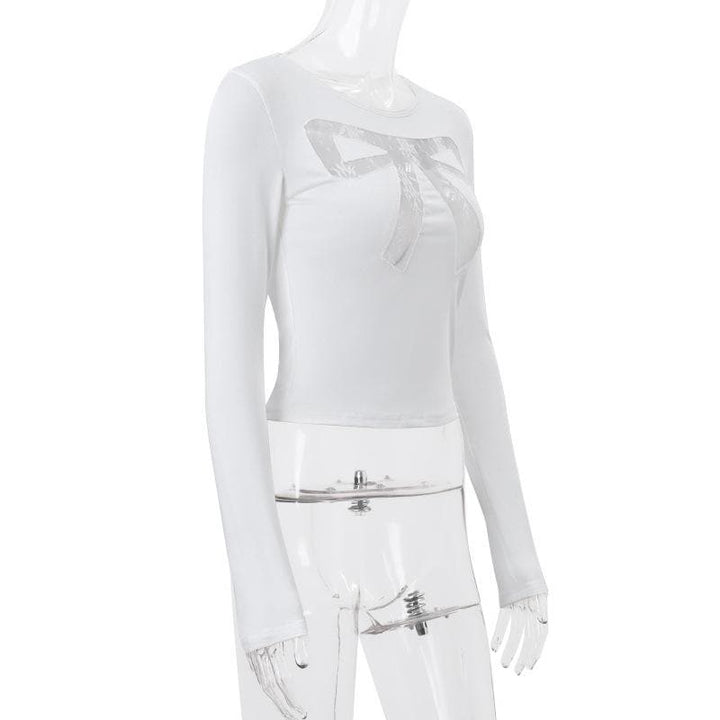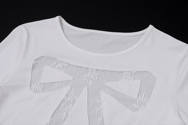 Long sleeve bowknot pattern lace mesh patchwork crewneck top