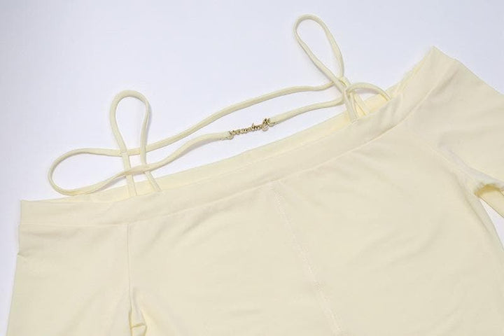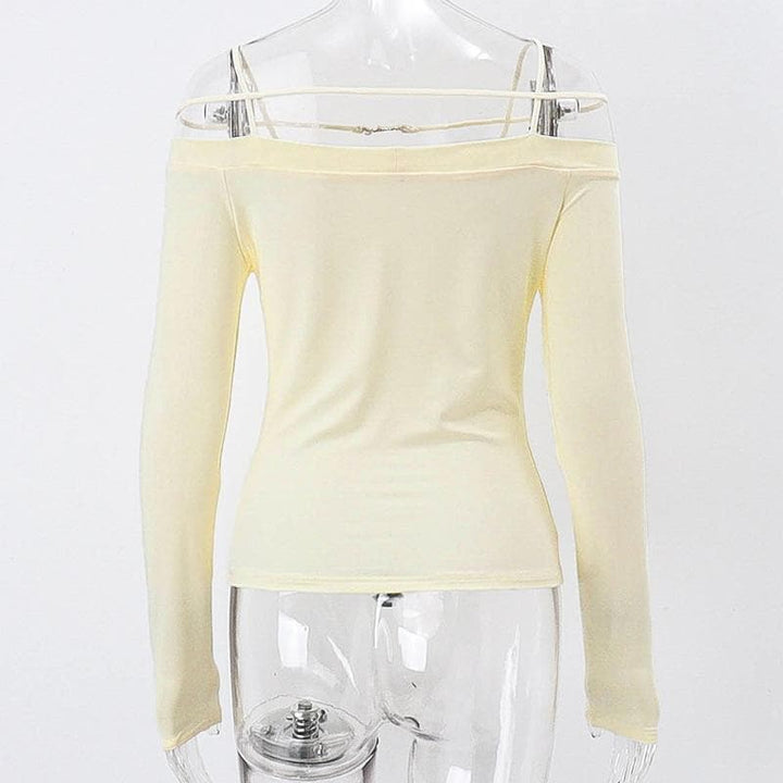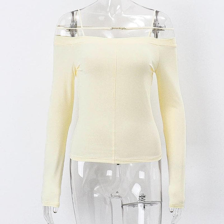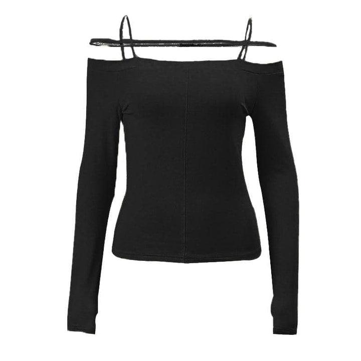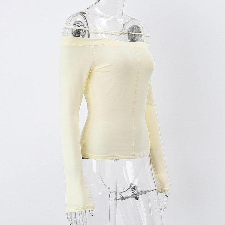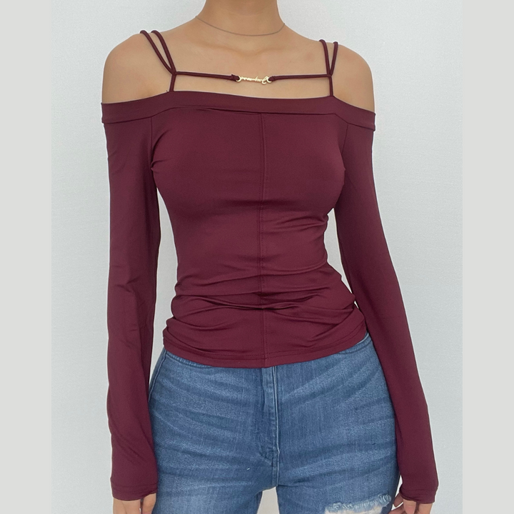 Long sleeve solid metal tag off shoulder top