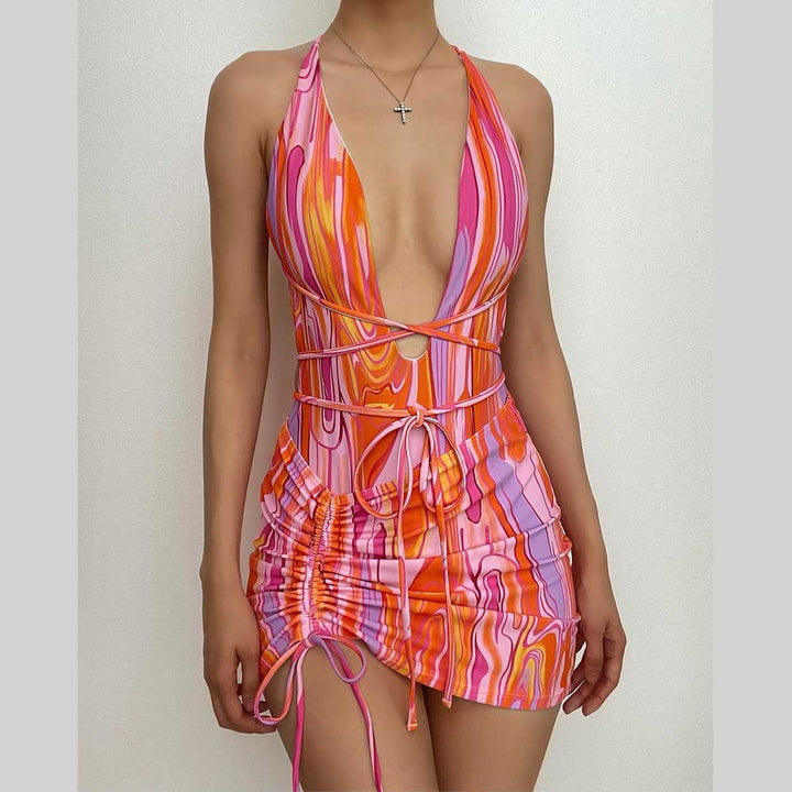 Ripple drawstring cross back one piece swimwear with beach skirt