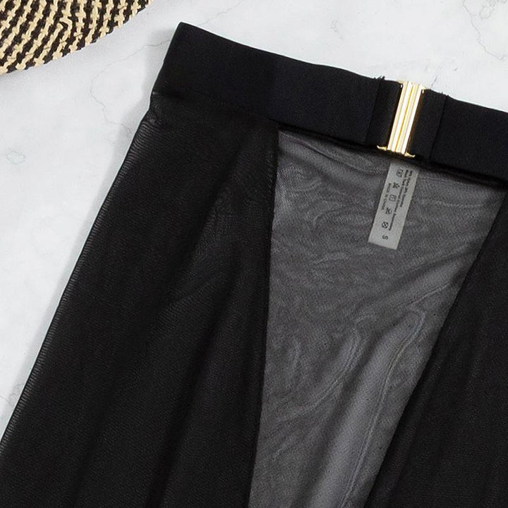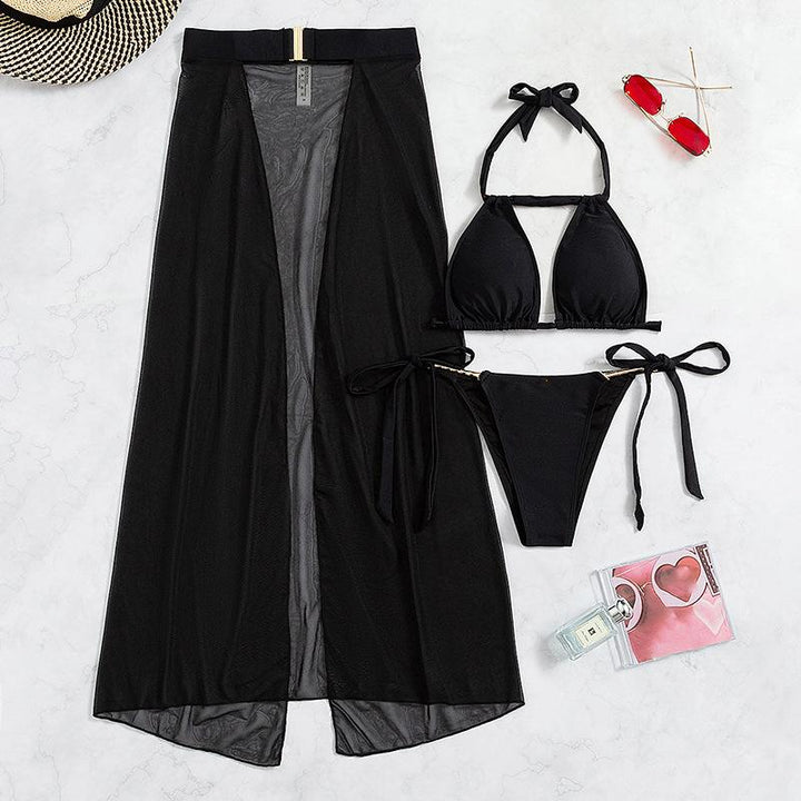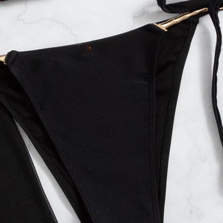 Ruched solid button mesh metal chain self tie 3 piece swimwear