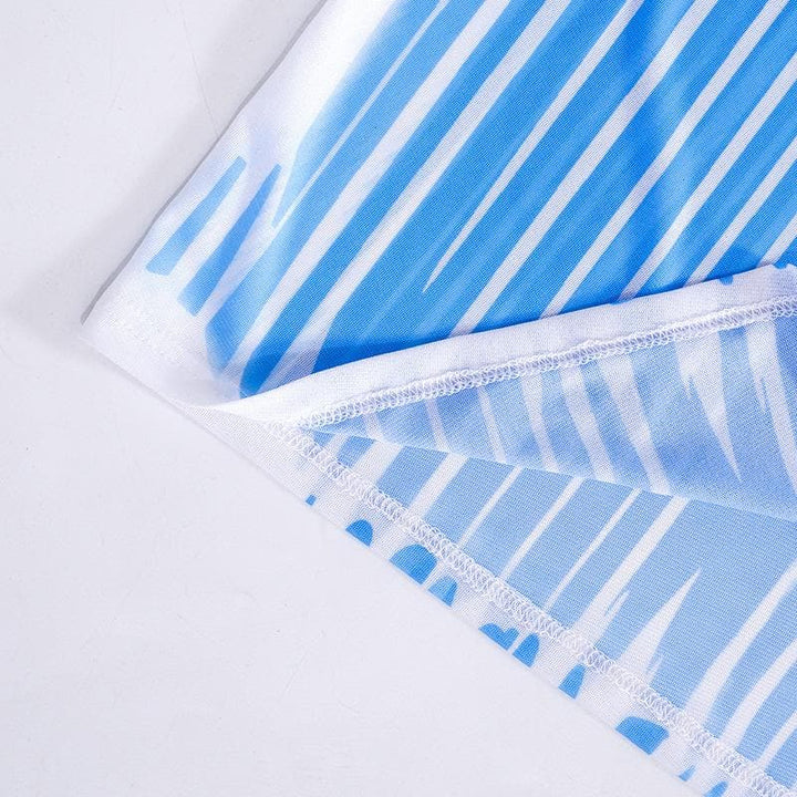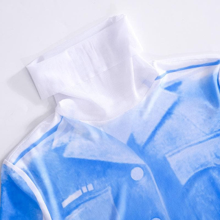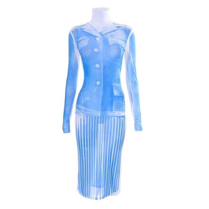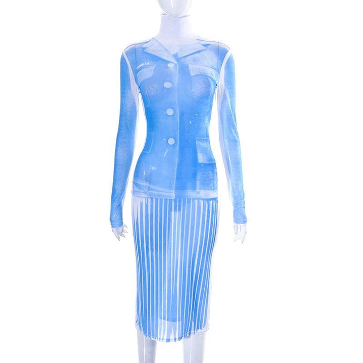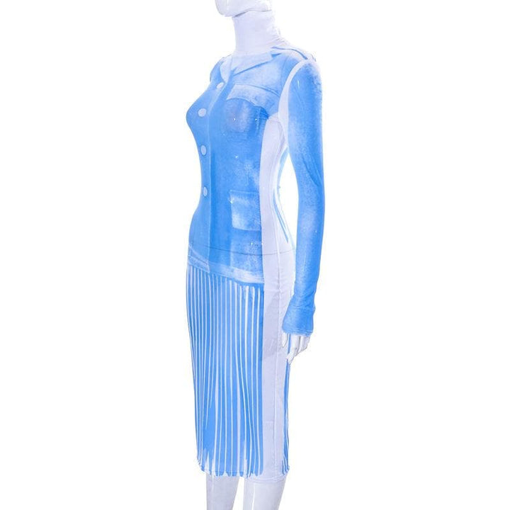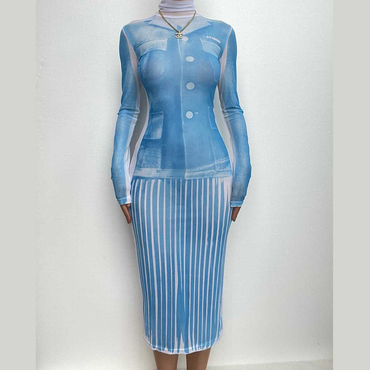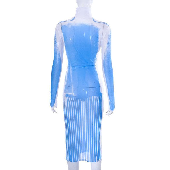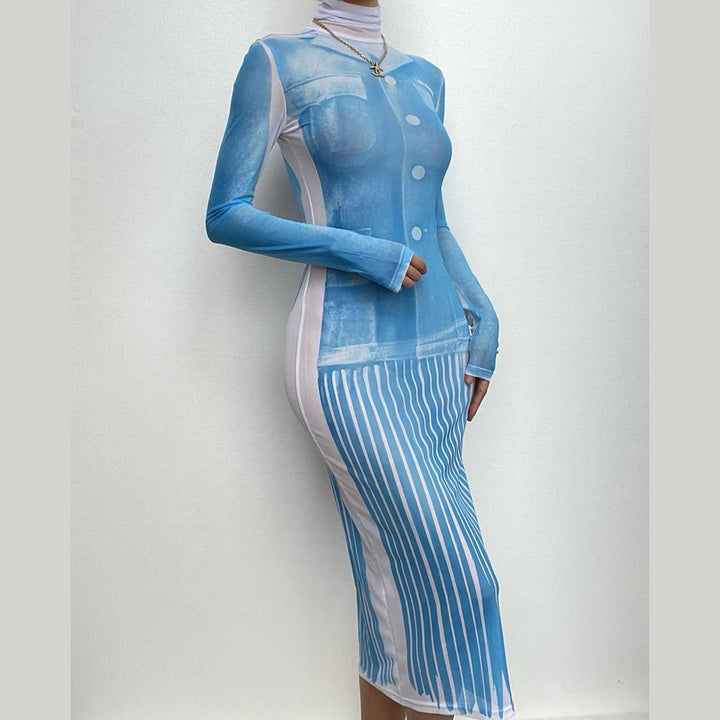 Sheer mesh see through turtle neck long sleeve contrast print midi dress | samba dress