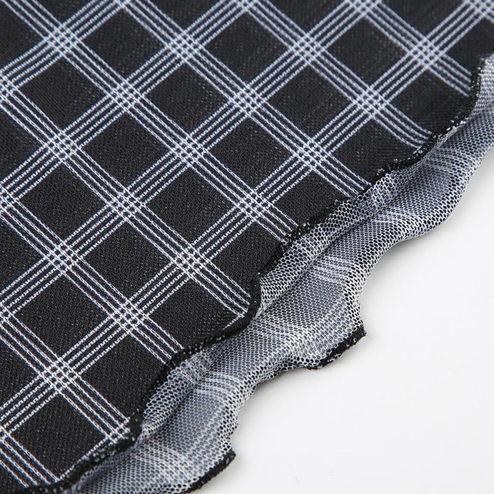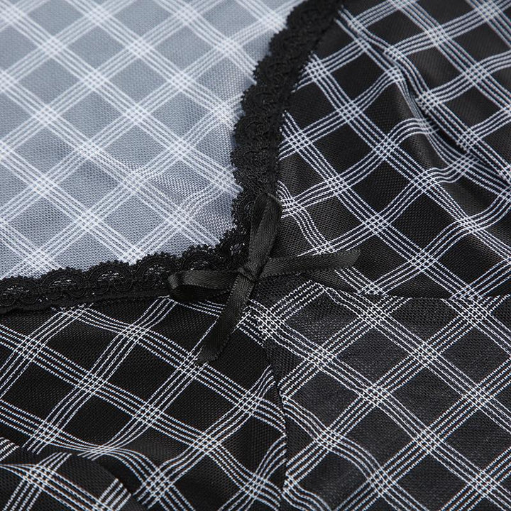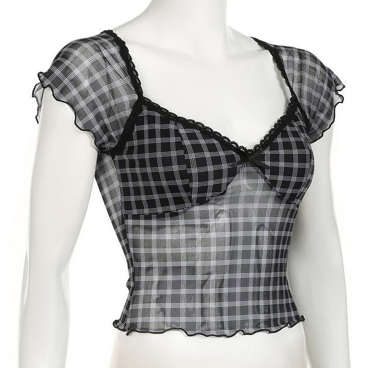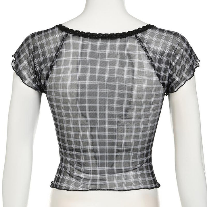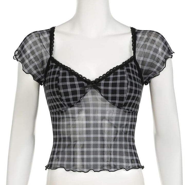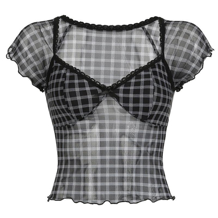 Short sleeve plaid lace hem bowknot mesh top