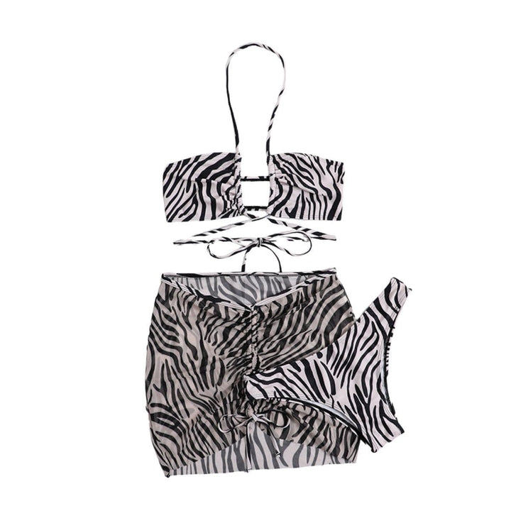 Zebra print mesh drawstring halter self tie 3 piece swimwear
