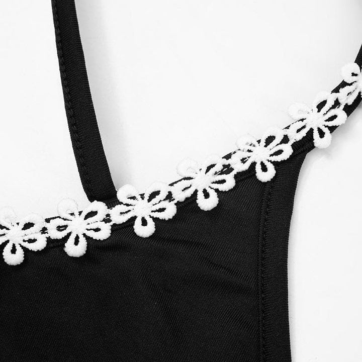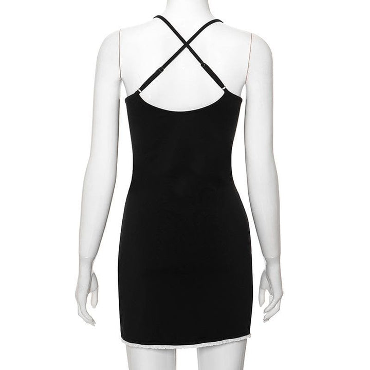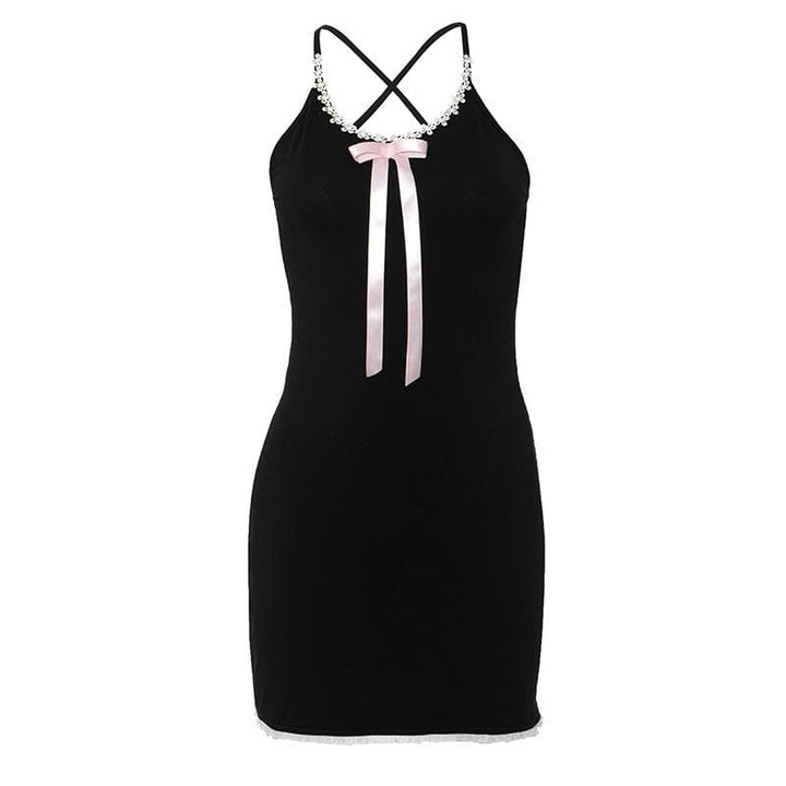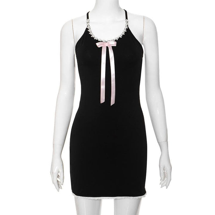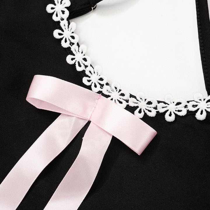 Robe courte camisole dos nu avec ourlet en dentelle et ruban à nœud papillon | Robe rave noire