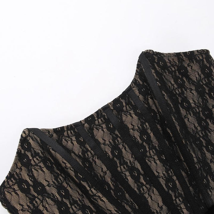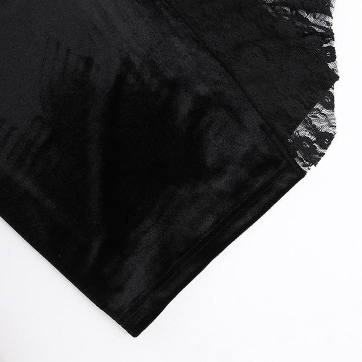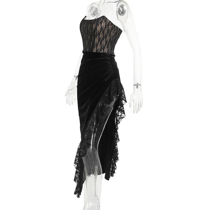 Robe midi bustier froncée smockée fendue en velours et dentelle tube irrégulier