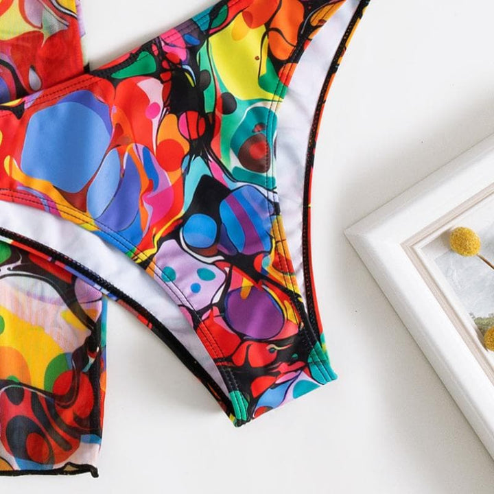 Maillot de bain 3 pièces mini-jupe abstraite à dos nu et à nouer dans le dos