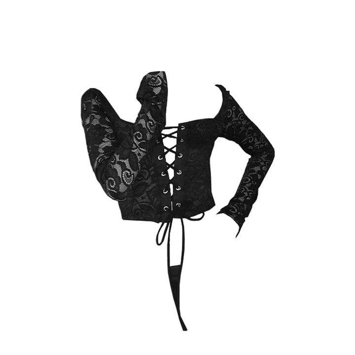 Haut court à manches longues évasées et col carré en dentelle transparente