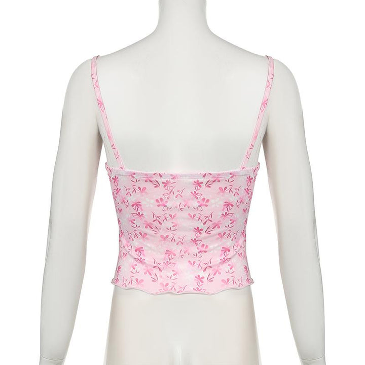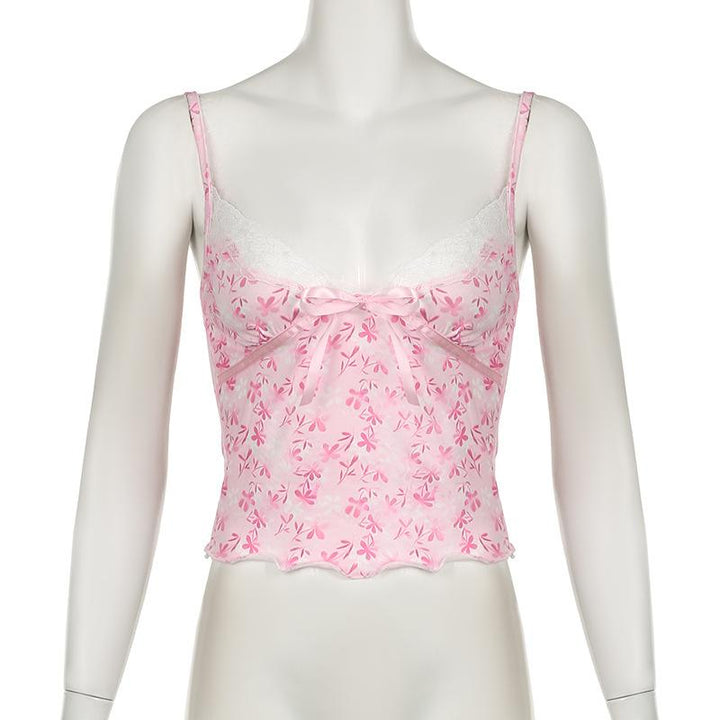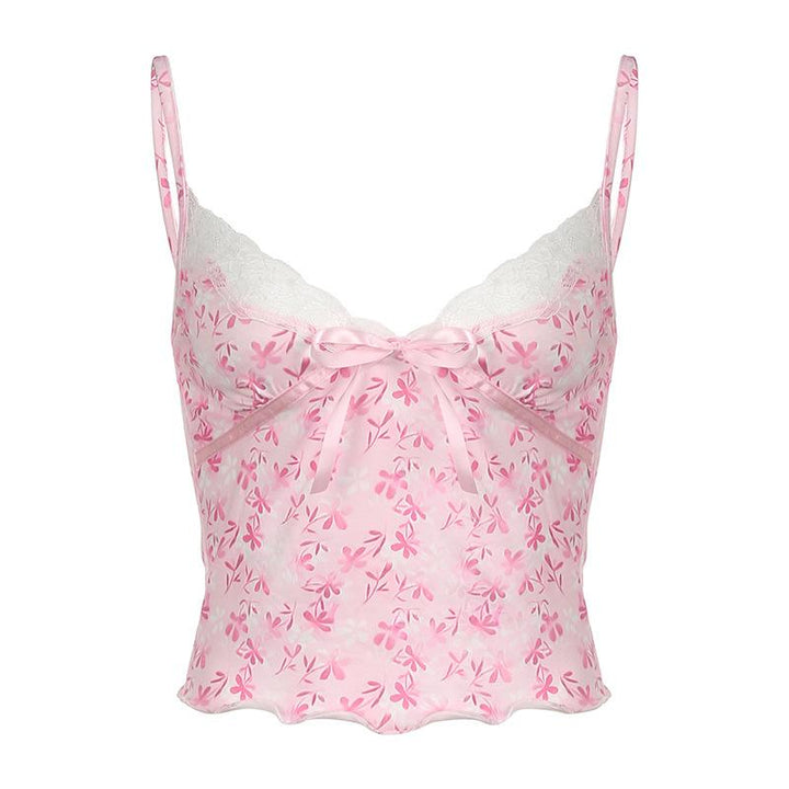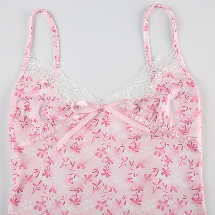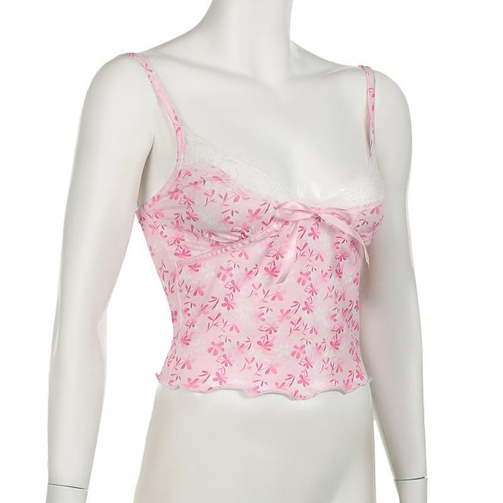 Haut caraco imprimé à volants et ourlet en dentelle avec nœud papillon et col en V