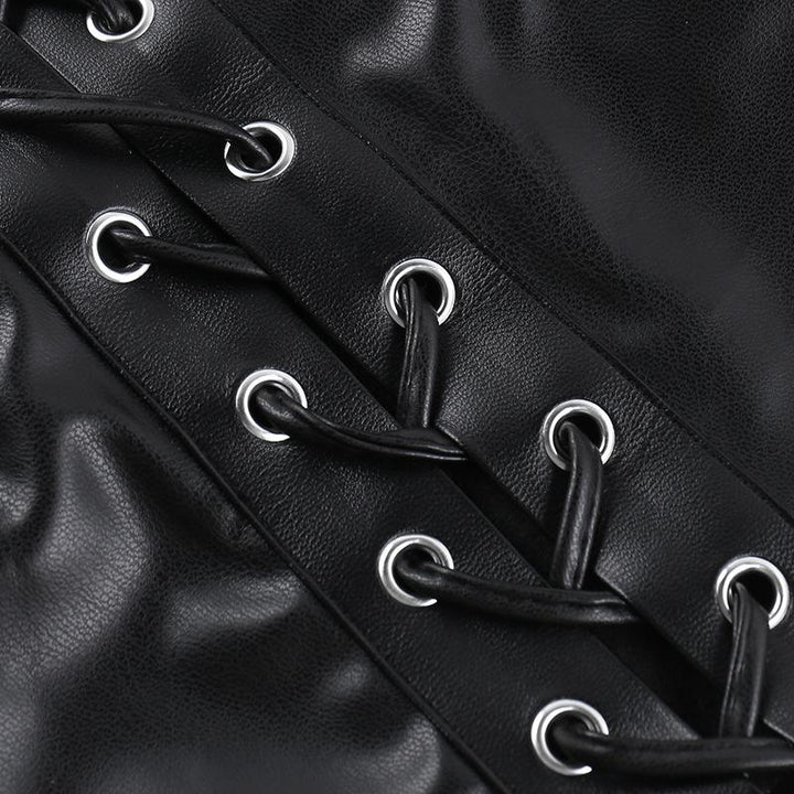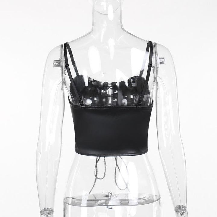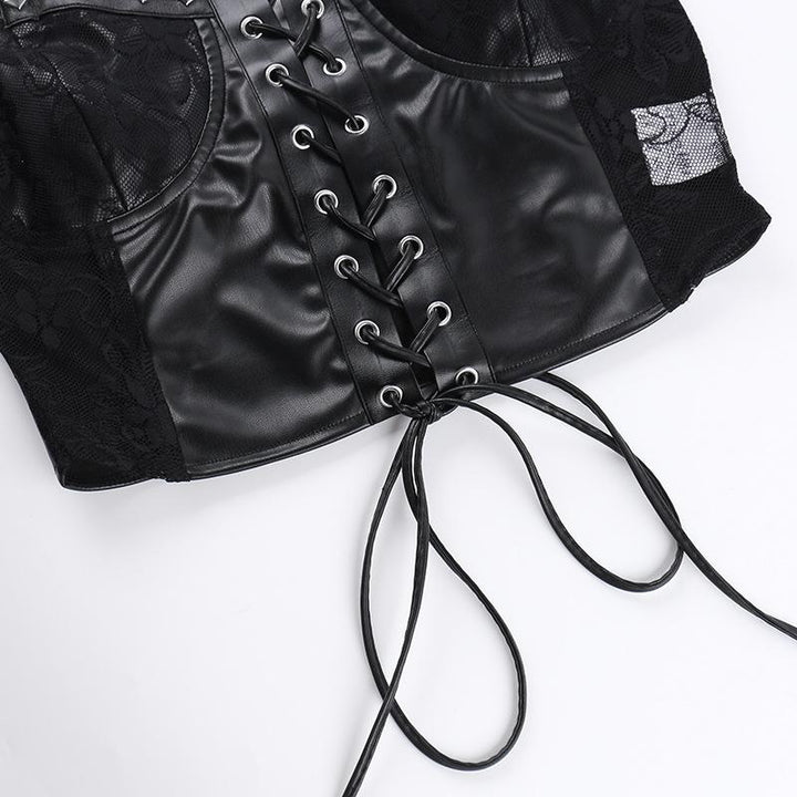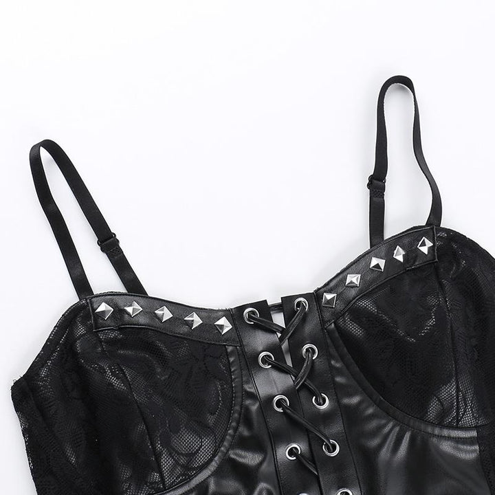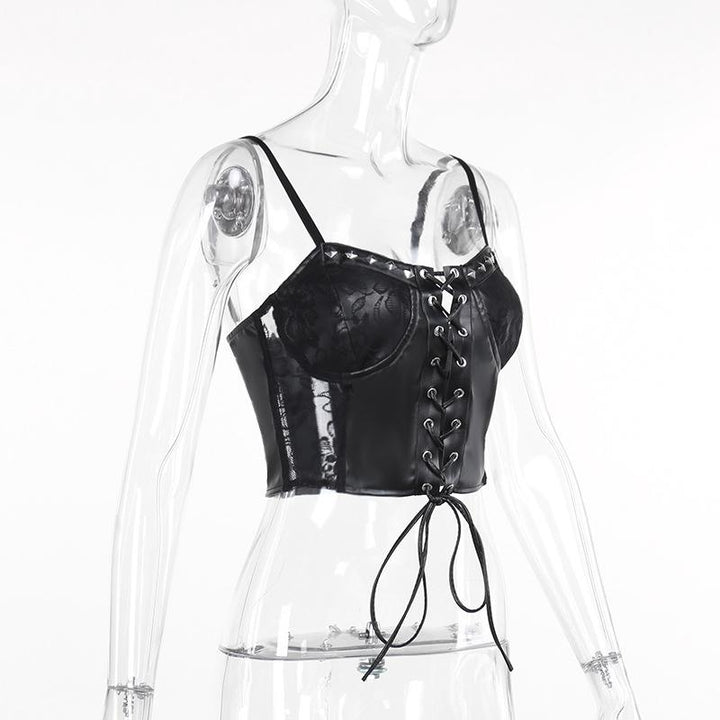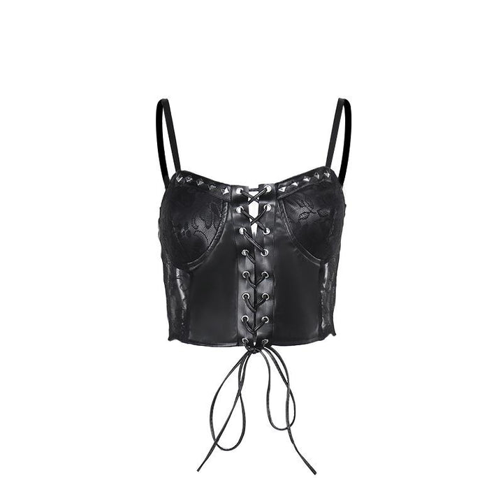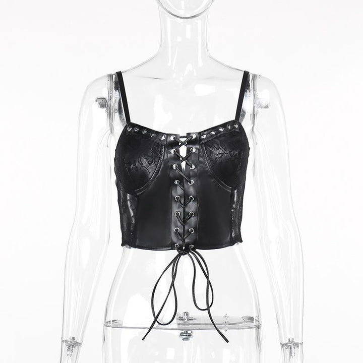 Lace up PU leather patchwork lace rivet cami top