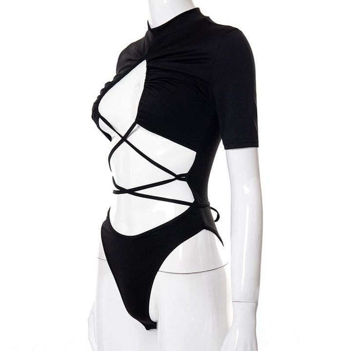 Short sleeve high neck ruched lace up hollow out bodysuit