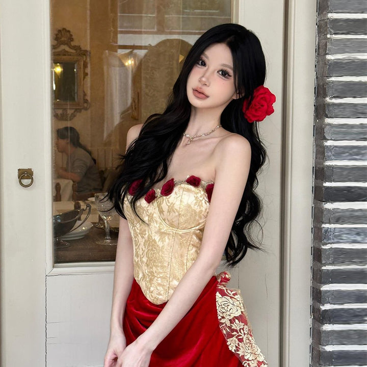 Sweetheart neck bustier flower applique contrast tube maxi dress